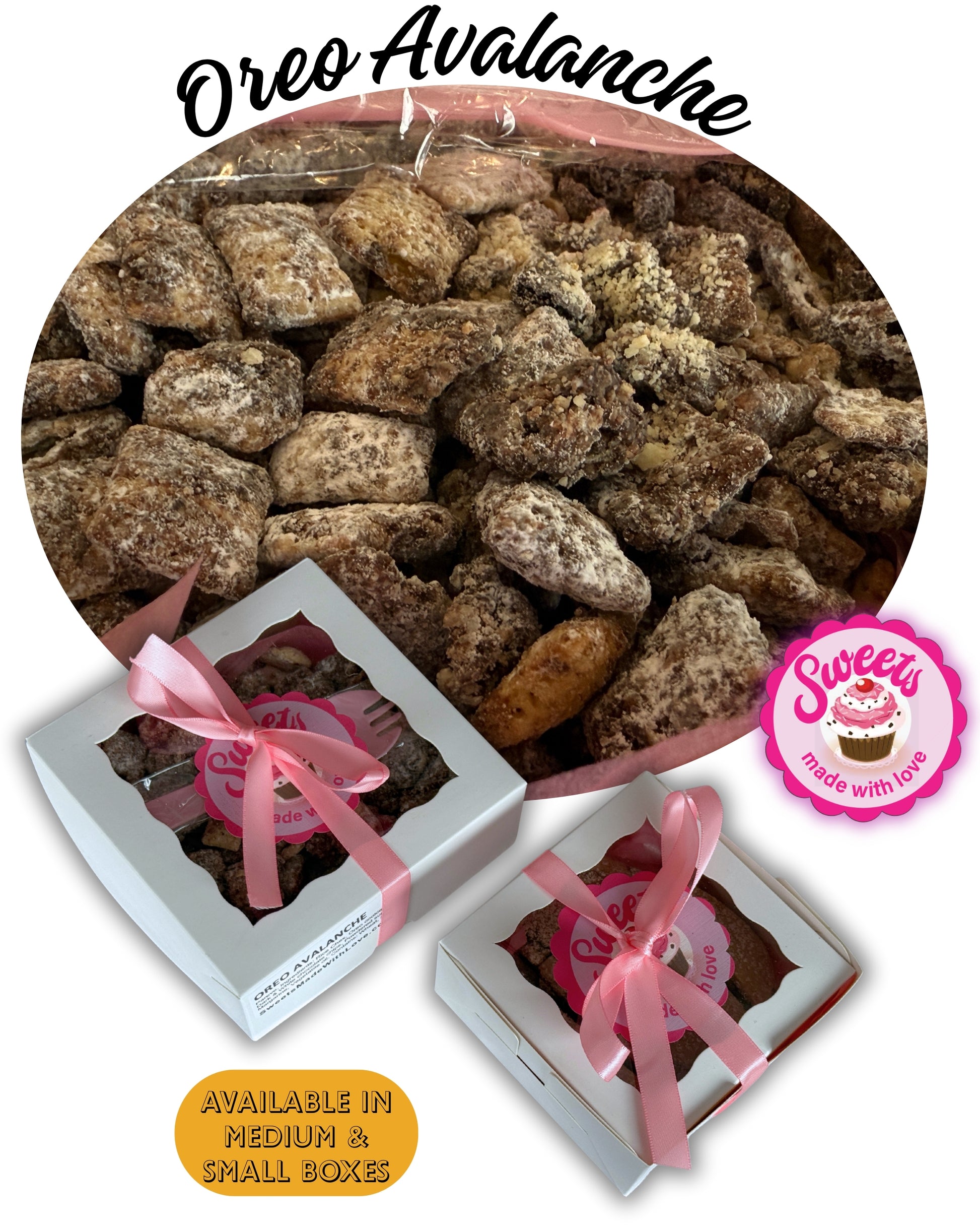 Ingredients: Rice Chex, Oreo cookies, Dark & White chocolate chips, Powdered sugar, Margarine, Vegetable oil.